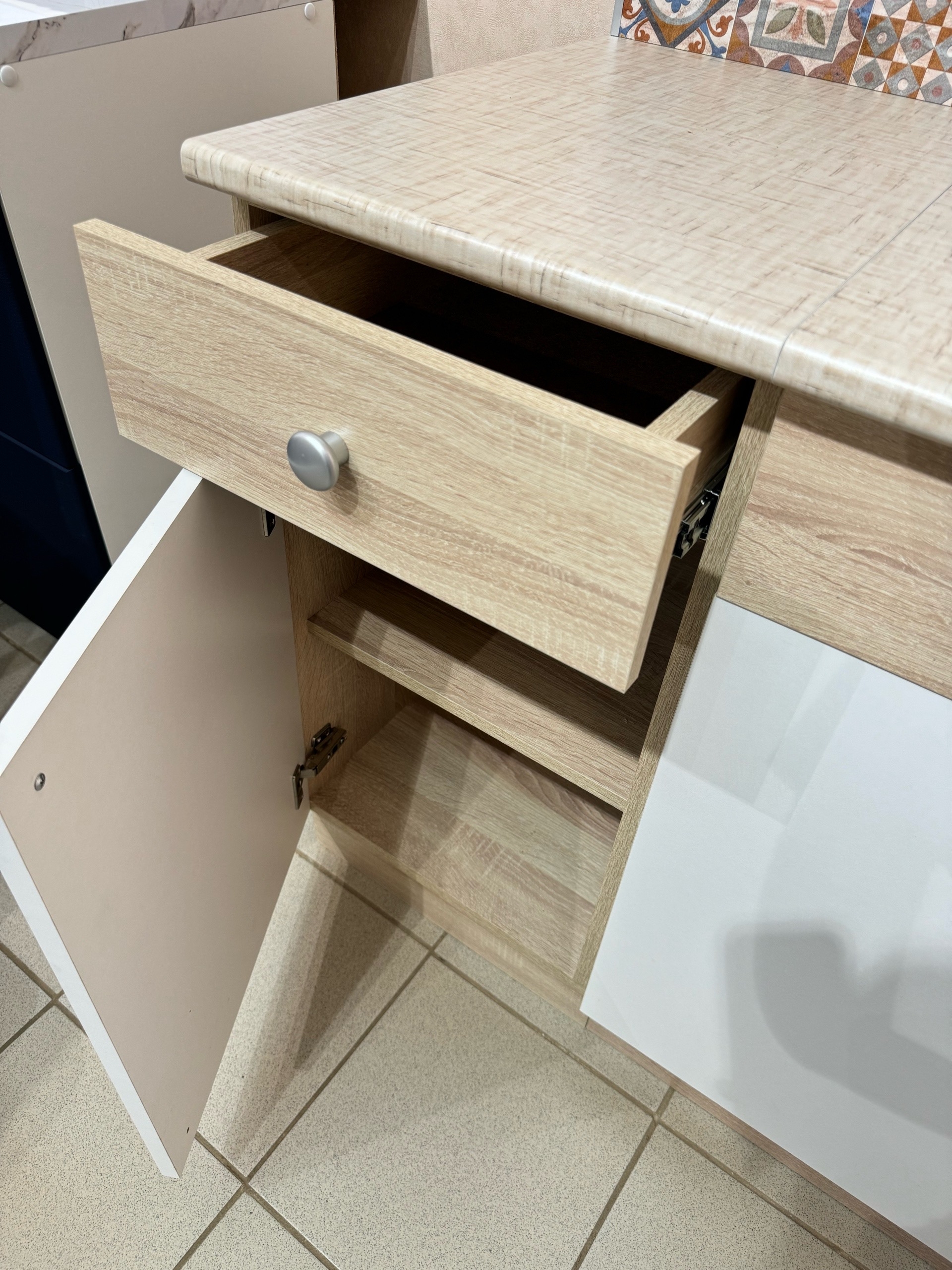 В 800мм-1шт., В 600мм.-1шт, нижние модули (корпуса с ящиками и распашными дверцами, фасады, ручки, столешницы) шкаф Н 400мм / 1 ящ -1шт.,