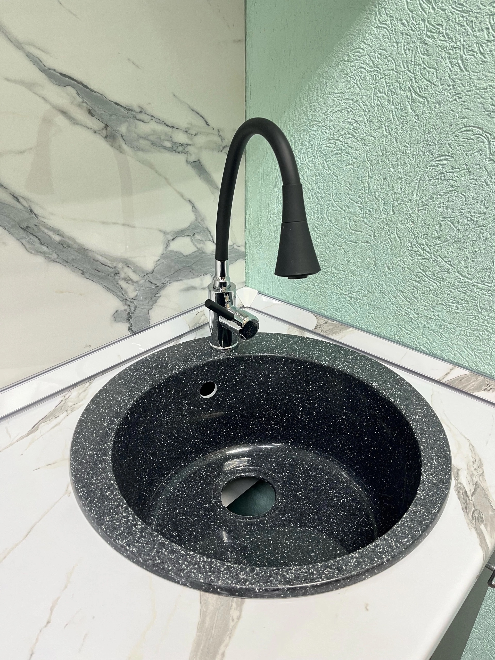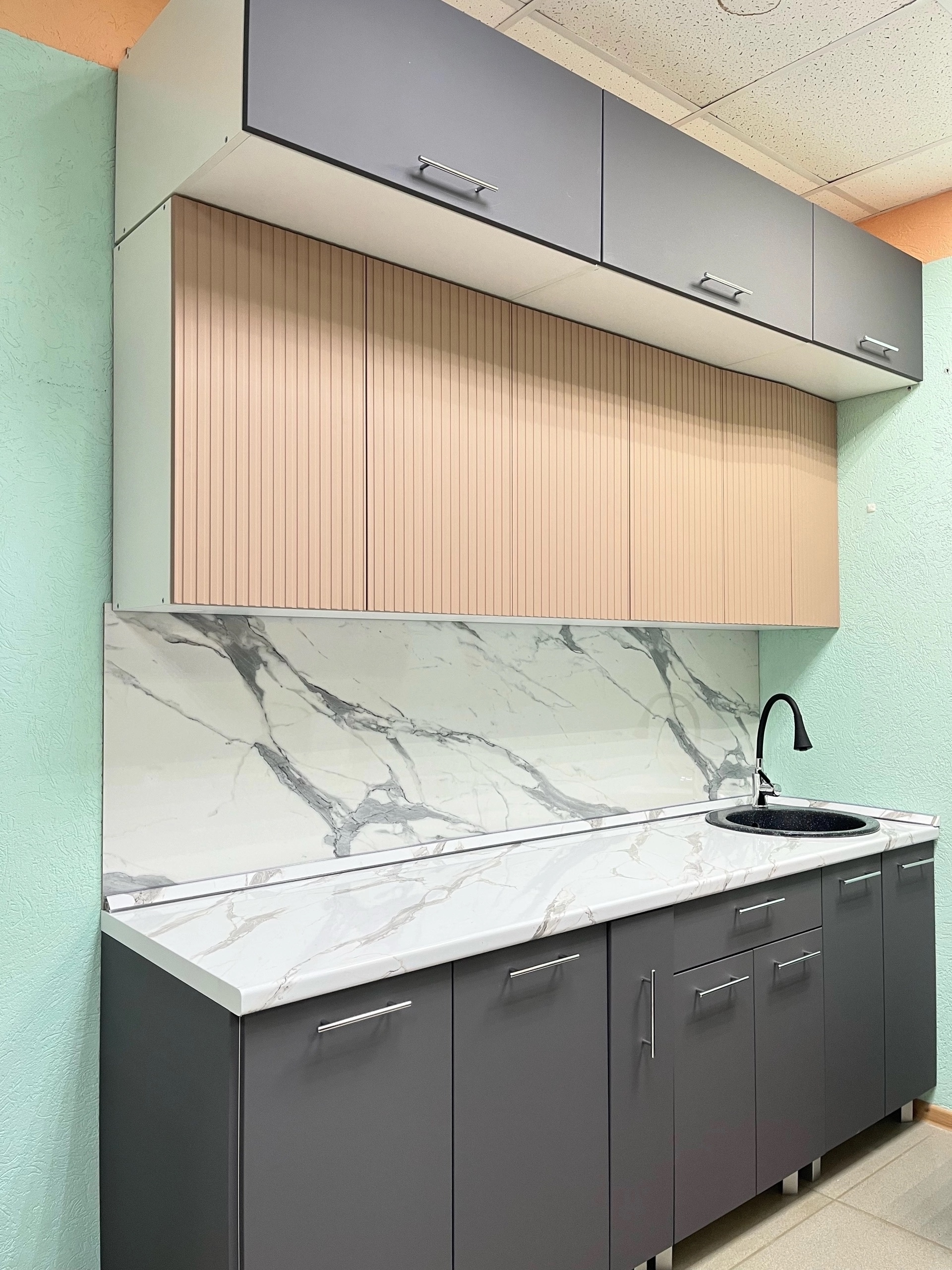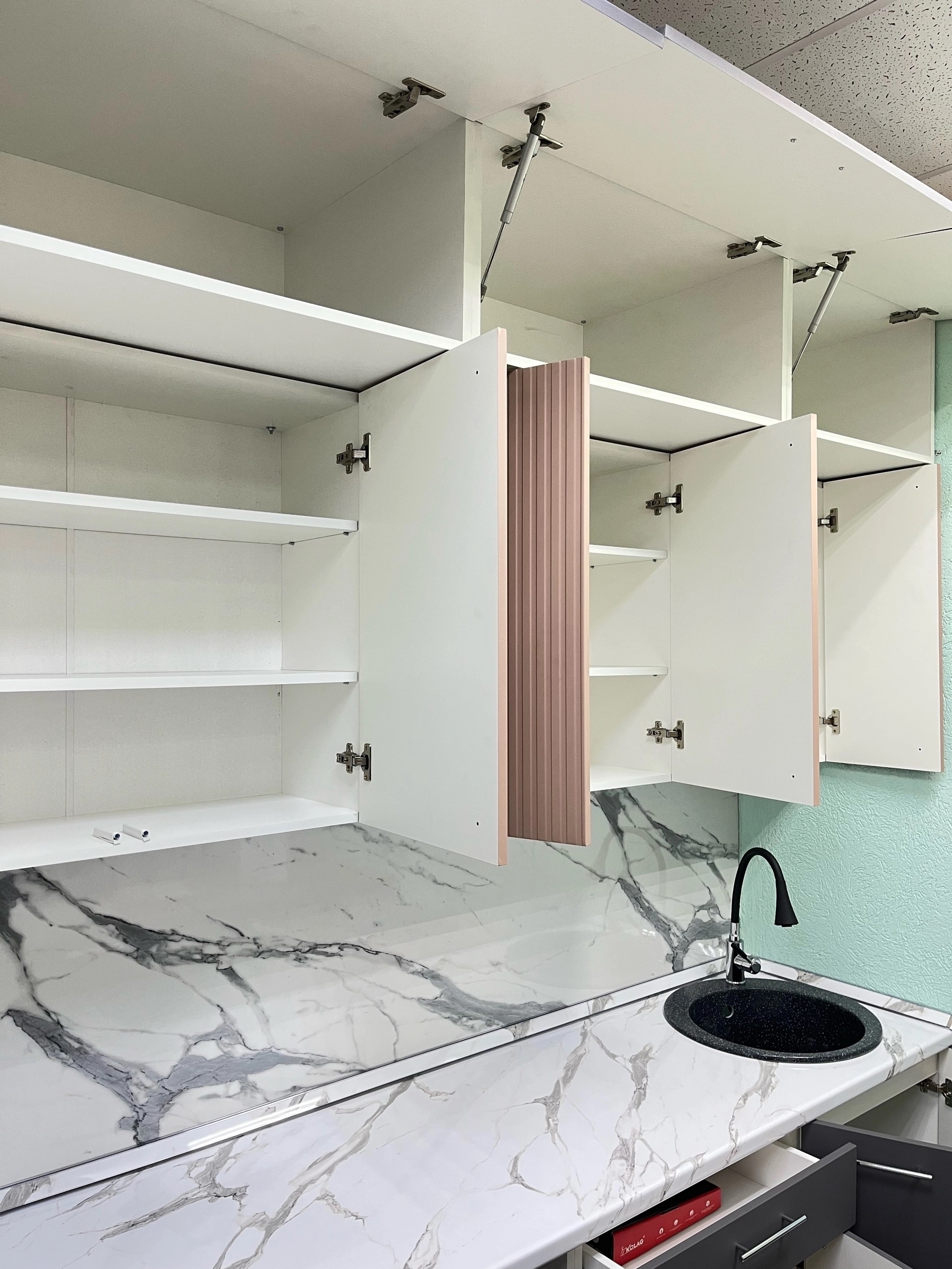 Раковина, сушилка для посуды, смеситель,стеновая панель, пропилы для техники и раковины, комплектующие, приобретаются отдельно.