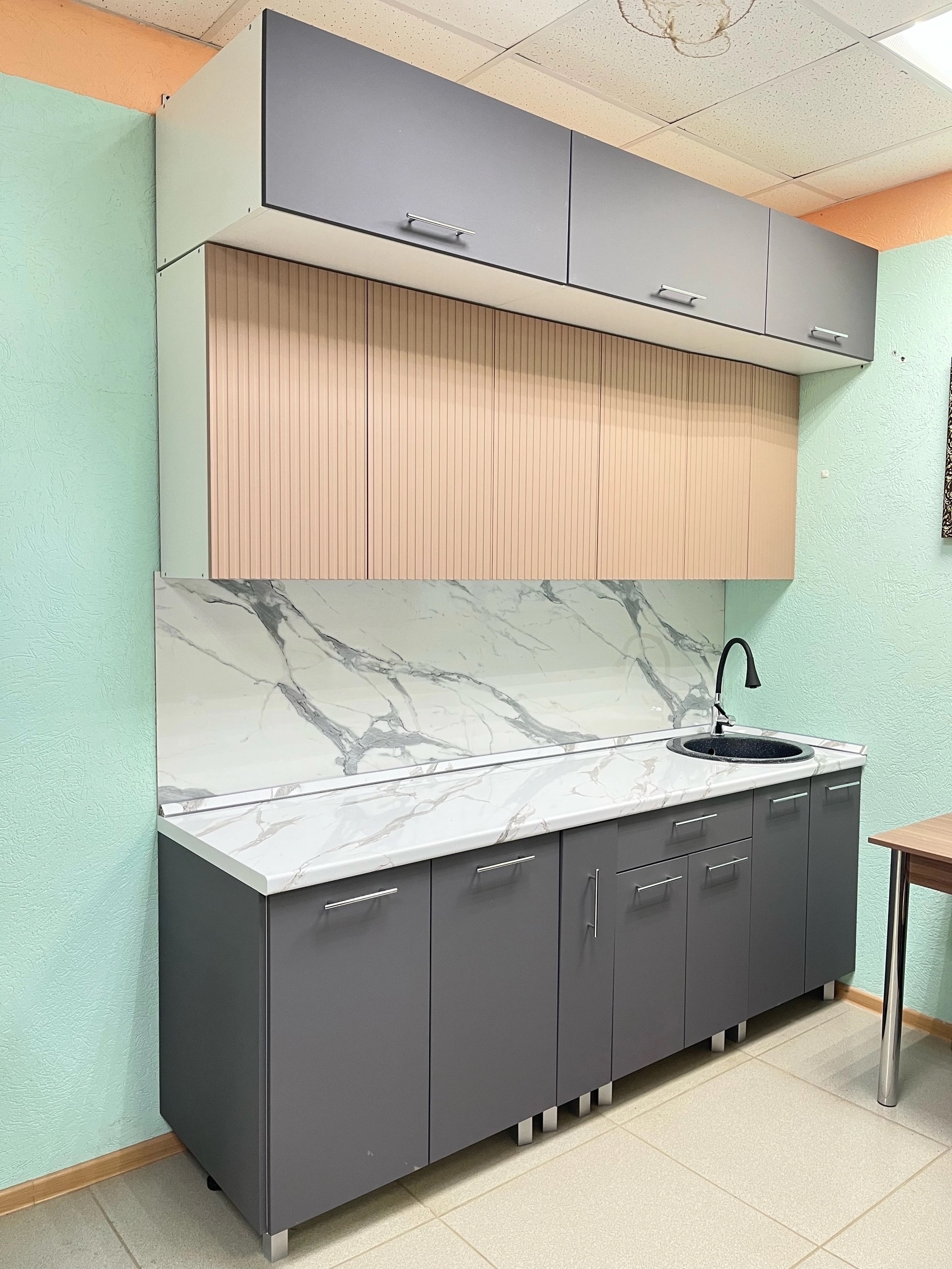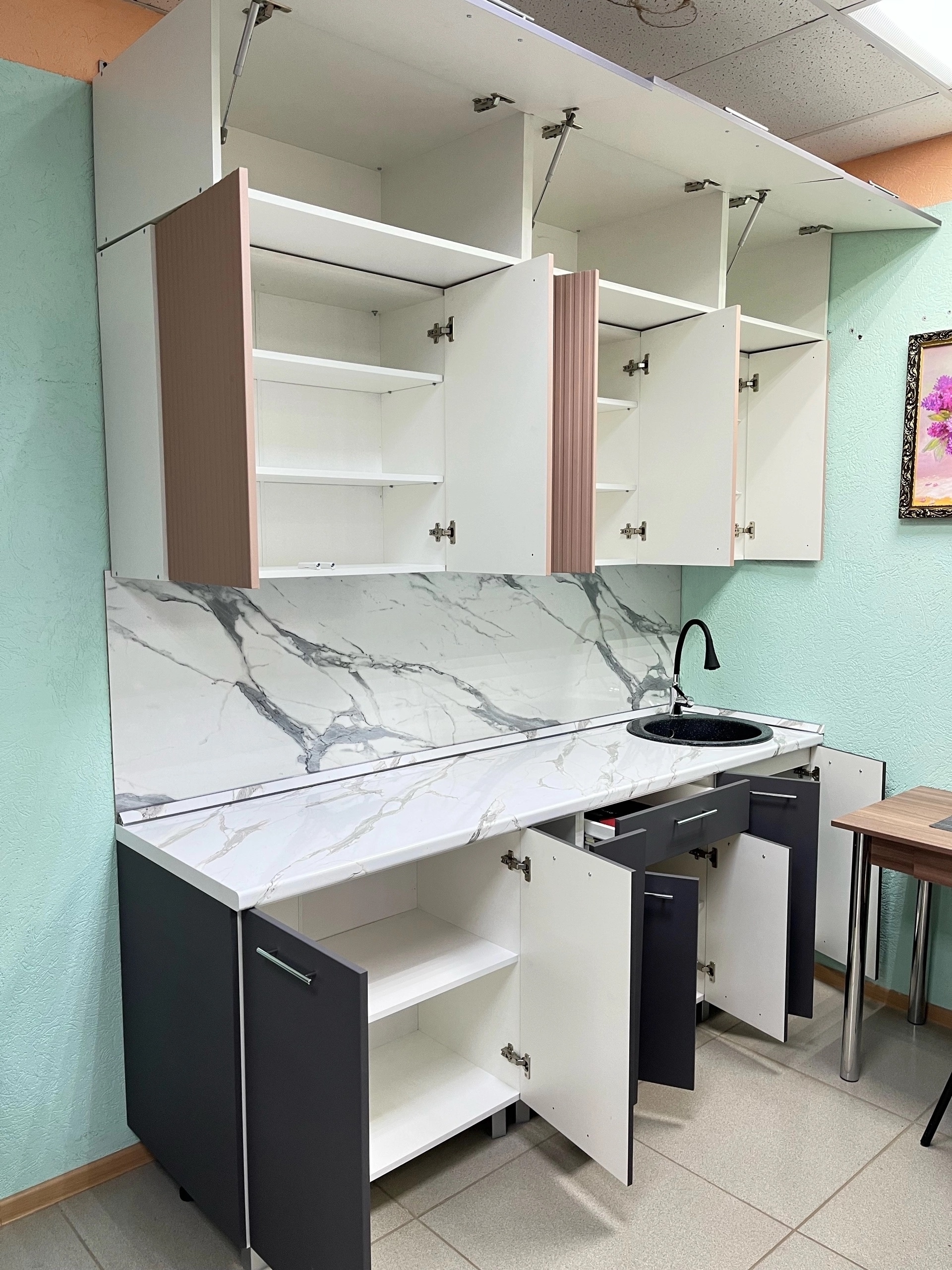 В комплектацию входят верхние модули ( корпуса, фасады с ручками), нижние модули (корпуса, фасады с ручками) столешница 38мм. (цвета индивидуально подбираются)