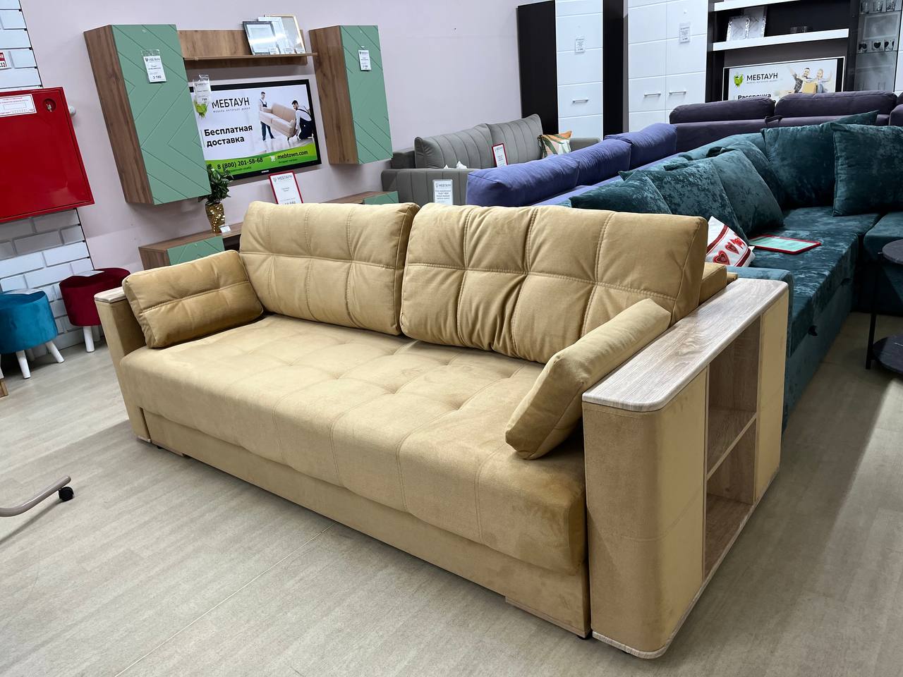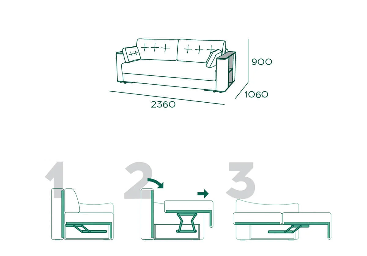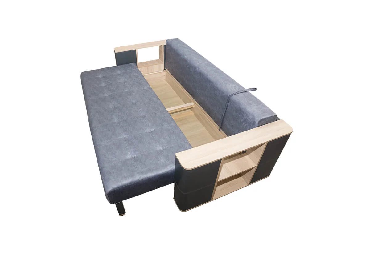 При трансформации диван находится вплотную к стене, раскладка производится в переднем направлении.