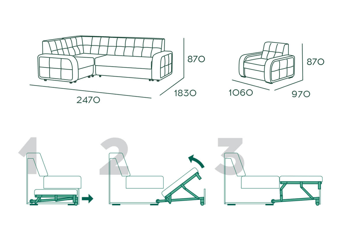 При трансформации диван находится вплотную к стене, раскладка производится в переднем направлении.